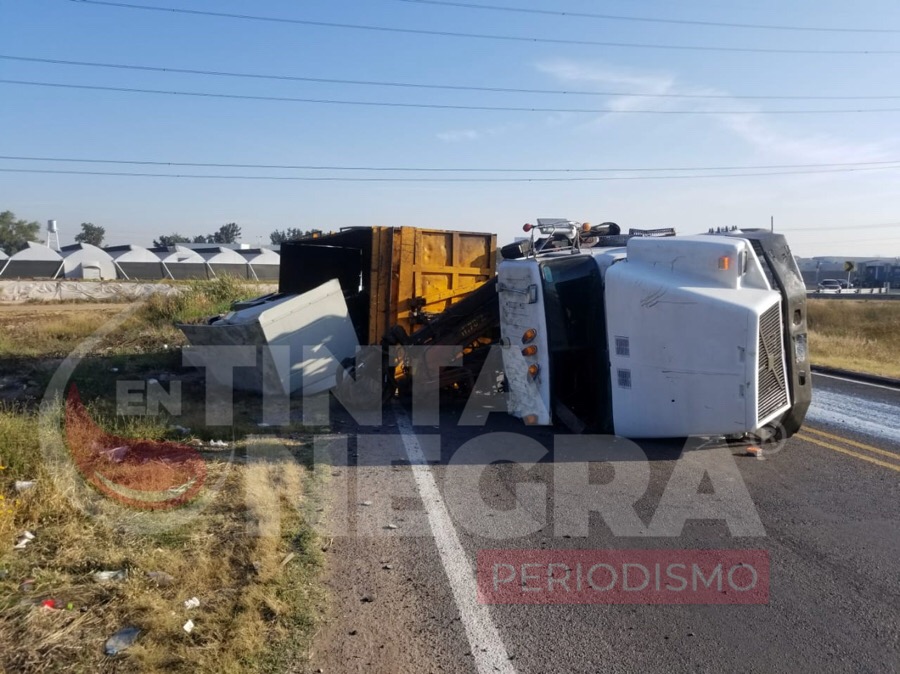 Irapuato.- Un tráiler volcó la mañana de este sábado en uno de los retornos de la carretera Irapuato-Abasolo.