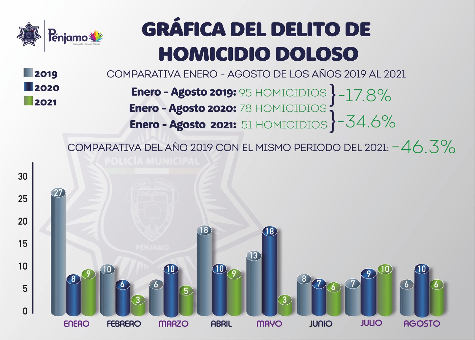 En comparativa con los años 2019 y 2020, los homicidios han disminuido en un 46.3 por ciento, resultado del trabajo coordinado entre Seguridad Pública de Pénjamo y demás instancias en materia de Estatal y Federal.