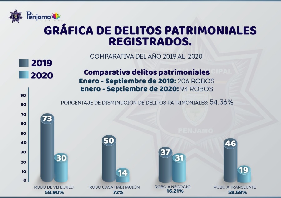 El robo a vehículo disminuyó en un 58.9 %, pasando de 73 en 2019 a 30 este 2020; de igual forma el robo a casa habitación pasó de 50 viviendas en 2019 a solo 14 en 2020, lo que significa una disminución del 72 por ciento.