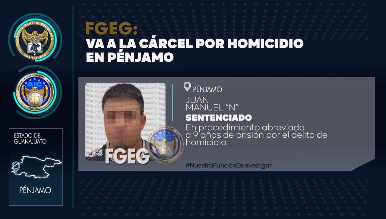 Pénjamo, Gto. 02 de abril de 2022.- JUAN MANUEL “N“, fue sentenciado a prisión por el asesinato de un hombre que se encontraba en un campo deportivo; la Unidad de Homicidios acreditó su responsabilidad, le fincó cargos por el crimen cometido, y ante las pruebas se declaró culpable de haber asesinado a Víctor “N” el 16 de mayo del 2021, en la ciudad de Pénjamo.