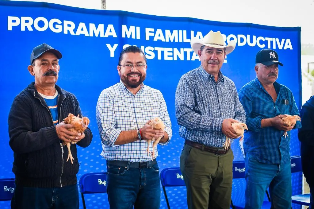 Pénjamo.- Continuando con la entrega de apoyos 2022 del Programa Mi Familia Productiva y Sustentable, 381 familias, recibieron hoy hasta su comunidad su paquete de aves de postura, evento encabezado por Paulo Bañuelos Rosales, titular de SDAyR y el Presidente de Pénjamo, Goyo Mendoza.