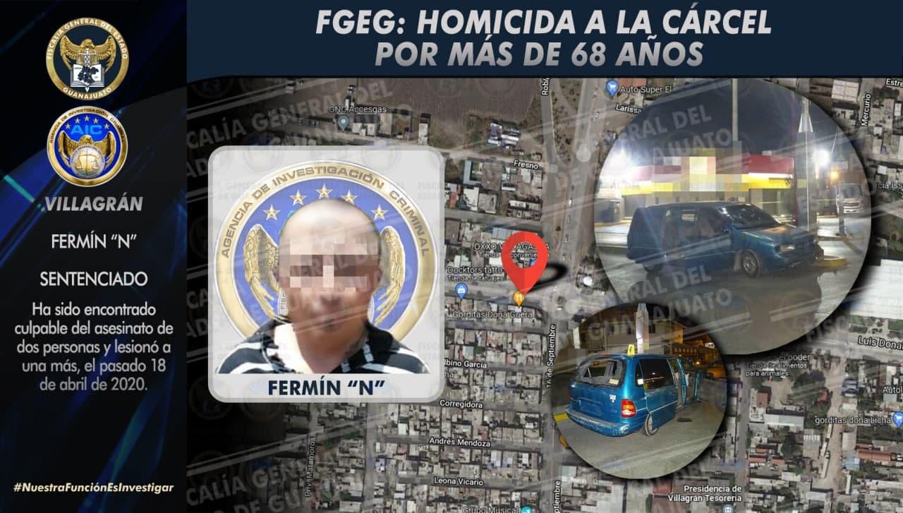 Villagrán, Gto. 10 de diciembre de 2021.- En juicio oral, un hombre fue sentenciado a pasar el resto de su vida tras las rejas al recibir una condena de 68 años y 9 meses de prisión. La Fiscalía General del Estado acreditó la responsabilidad de FERMÍN “N” en los delitos de homicidio calificado y homicidio calificado en grado de tentativa en agravio de dos hombres y un tercero lesionado.