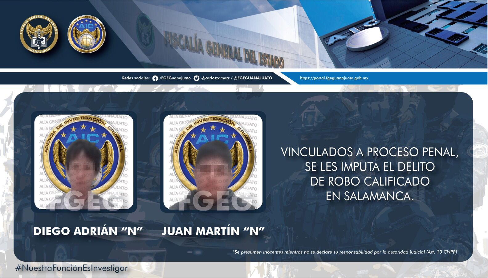 Salamanca, Gto., 08 de febrero de 2023.- Una diligencia de reconocimiento, entre otras evidencias, permitieron a la Fiscalía General del Estado, acreditar la probable responsabilidad de dos presuntos asaltantes que, con lujo de violencia, despojaron a una víctima de su motocicleta en la ciudad de Salamanca.
