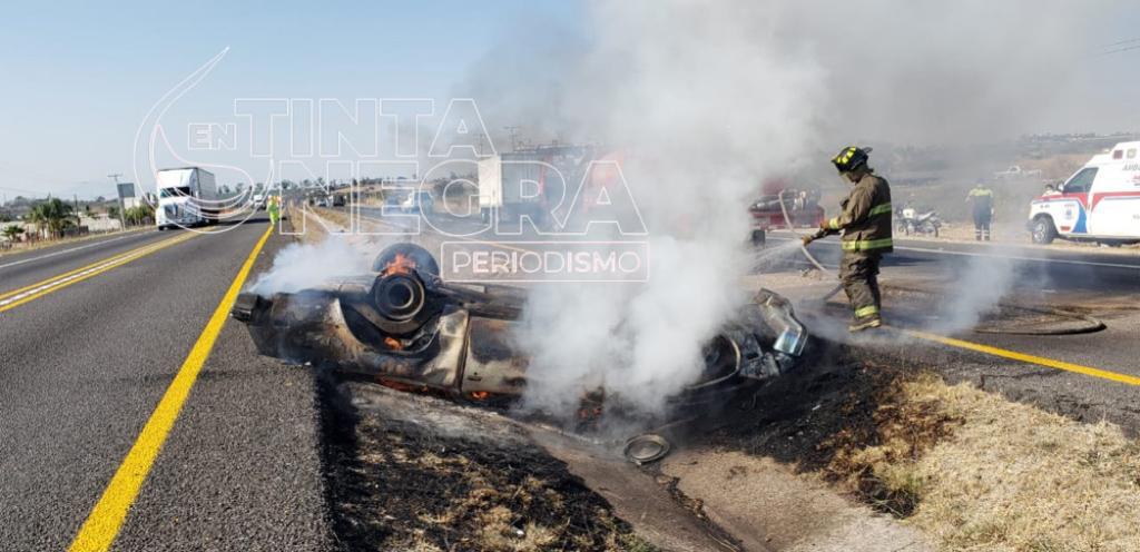 Pénjamo, Gto; 12 de enero del 2022.- Dos sexagenarios se salvaron de morir tras volcar y posteriormente incendiarse el vehículo que tripulaban.