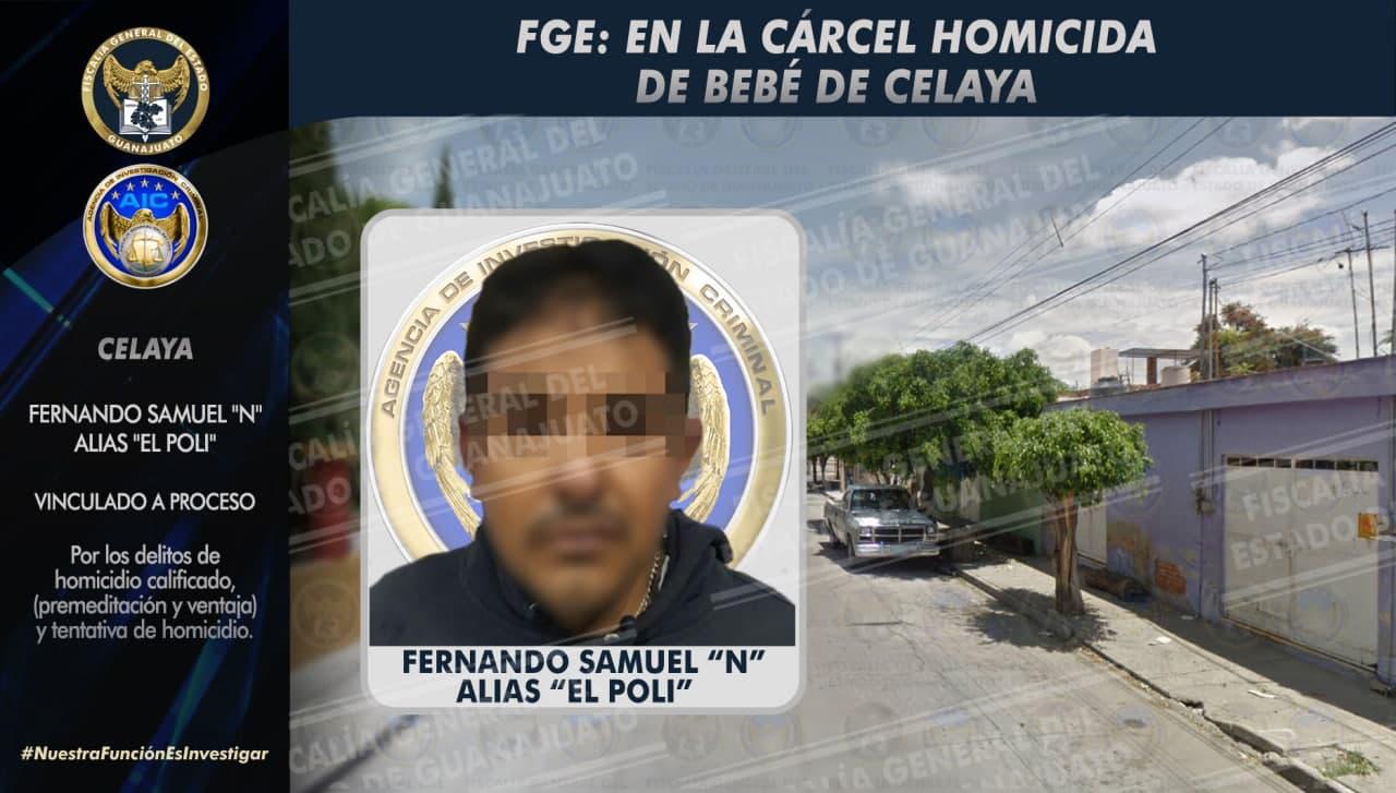 Celaya, Gto. 24 de febrero de 2022.- La Fiscalía General del Estado logró avances en el esclarecimiento del homicidio de una menor de 8 meses y de su tío, al ubicar y detener a FERNANDO SAMUEL “N”, uno de los presuntos responsables. El sujeto de 29 años conocido como “El Poli”, fue imputado por los hechos que la ley señala como el delito de homicidio calificado, (premeditación y ventaja) y tentativa de homicidio en agravio de dos mujeres.