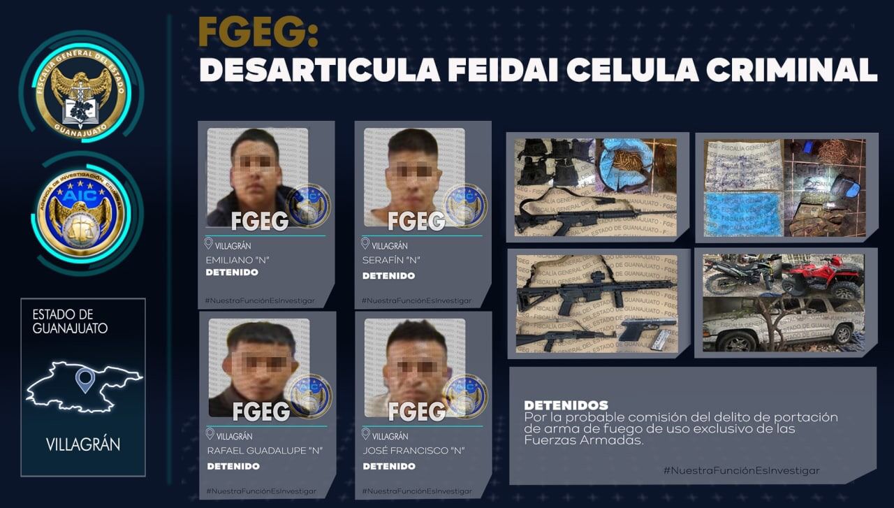 Se logró detener a cuatro sujetos, identificados como *RAFAEL GUADALUPE “N”, EMILIANO «N», SERAFÍN “N” y JOSÉ FRANCISCO “N”*, a quienes se les encontró en posesión de armas de fuego de uso exclusivo, chalecos balísticos, equipos de comunicación tácticos, cargadores, cartuchos útiles, motocicletas con reporte de robo, entre otros instrumentos del delito.
