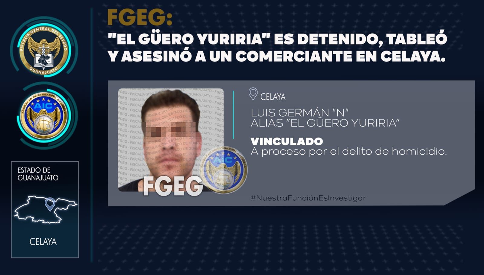 Celaya, Gto. 19 de abril de 2022.- La Fiscalía General del Estado ubicó y detuvo a un hombre llamado LUIS GERMÁN “N”, identificado como probable inculpado en el homicidio de Blas “N” de 44 años de edad, un comerciante del mercado Morelos, quien fue encontrado sin vida, con huellas de violencia, en la colonia El Dorado en la ciudad de Celaya, el 08 de octubre de 2021.