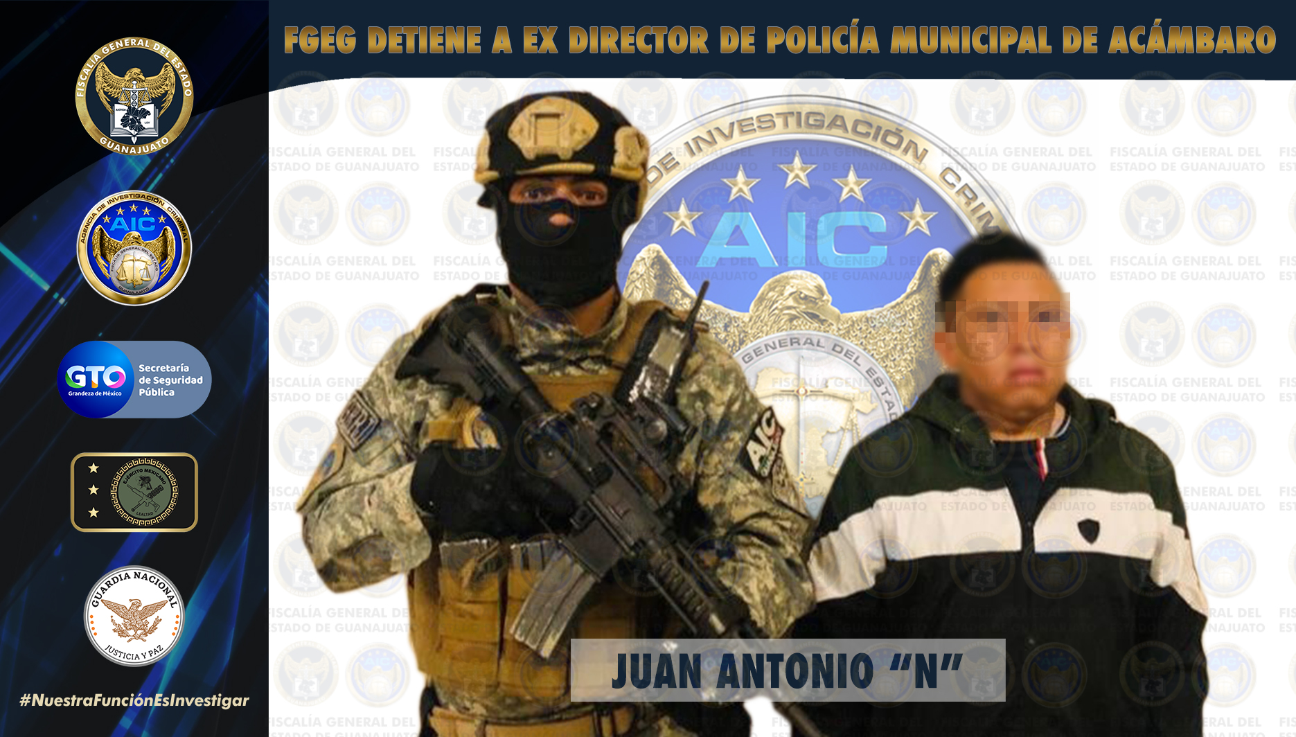 Guanajuato, Gto. 09 de octubre de 2021.- En una intervención derivada de una investigación criminal, la Fiscalía General del Estado en accionar coordinado con efectivos federales y estatales, detuvieron a JUAN ANTONIO “N”, de 38 años, ex Director de Seguridad Pública Municipal en el municipio de Acámbaro y a otras personas, de las cuales se darán detalles más adelante.