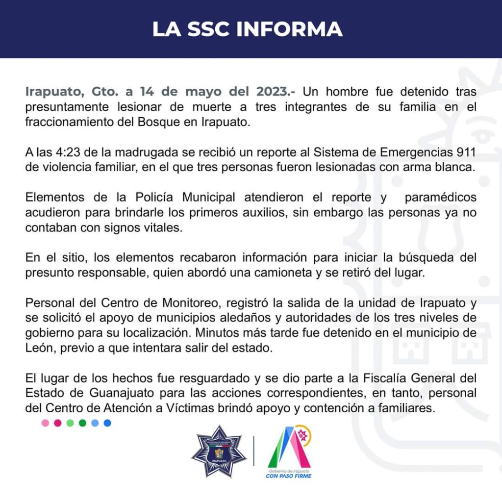 Irapuato,  Gto; 14 de mayo del 2023.- Un hombre fue detenido tras privar de la vida con arma punzocortante a su pareja y suegros en la calle Manzano en los límites del fraccionamiento del Bosque y barrio Calzada de Guadalupe.