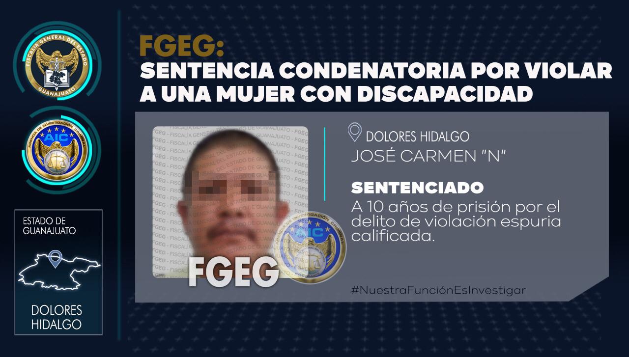 Dolores Hidalgo, Gto. 08 de abril de 2022.- JOSÉ CARMEN “N” purgará una sentencia penal por hechos acontecidos el 24 de marzo del año pasado, cuando la víctima se encontraba en su dormitorio y aproximadamente a las 11:30 de la noche, el sentenciado ingresó al mismo de forma sigilosa y sin autorización, para de manera posterior abusar sexualmente de ella.