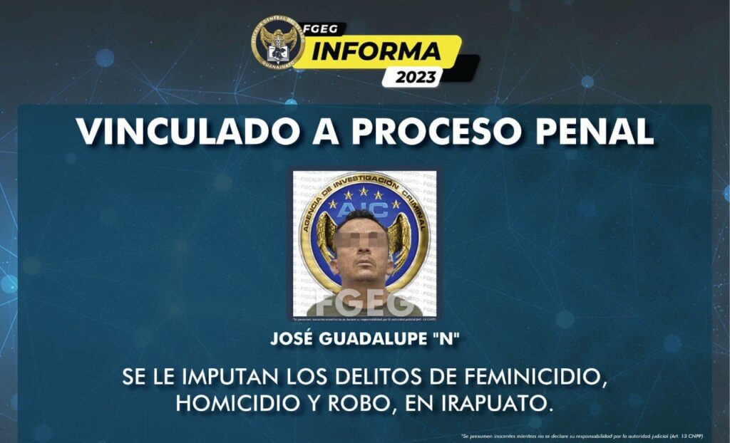 El inculpado quedó a disposición de la Fiscalía de Guanajuato, donde se inició una carpeta de investigación en la que es acusado por los delitos de feminicidio, homicidio y robo, en agravio de la familia que masacró en la ciudad de Irapuato.