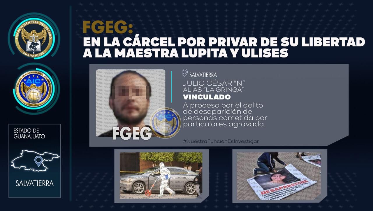 Salvatierra, Gto. 18 de marzo de 2022.- JULIO CÉSAR “N”, alias “La Gringa” fue detenido bajo orden de aprehensión y llevado a audiencia, imputado por el delito de desaparición de personas cometida por particulares en agravio de la profesora María Guadalupe “N” y Ulises “N”.