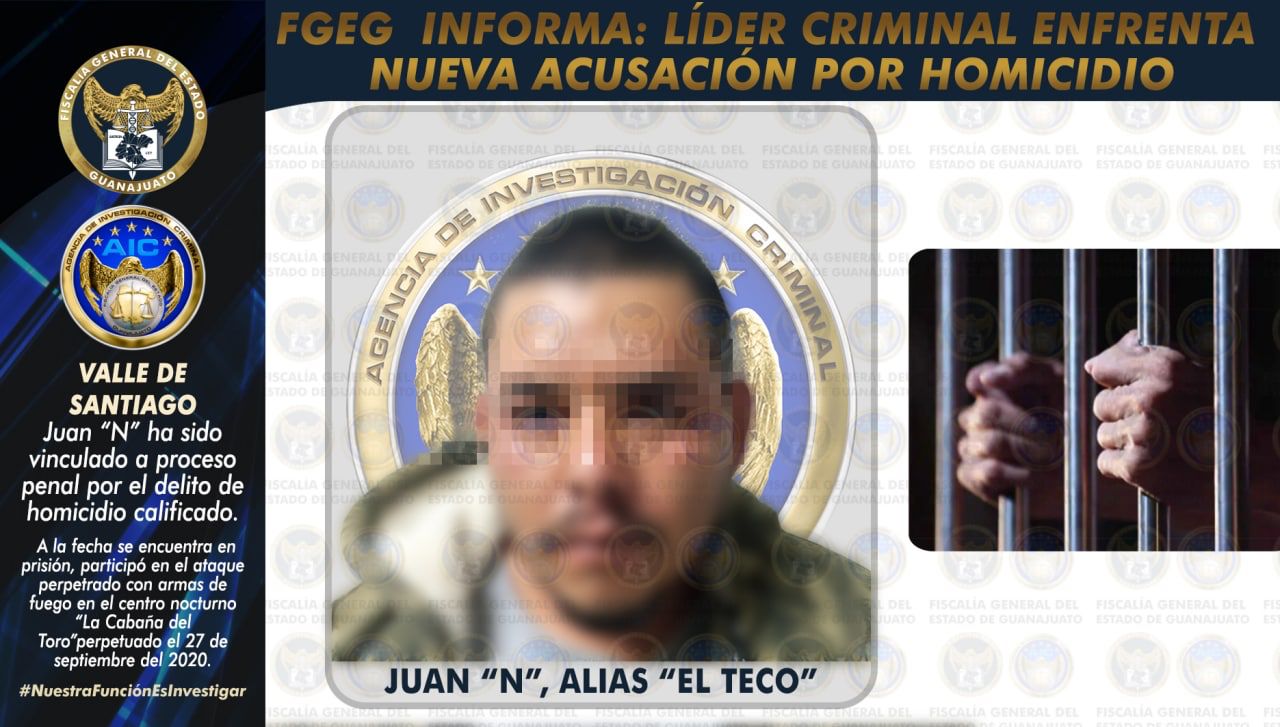 Valle de Santiago, Gto. 16 de noviembre de 2021.- “El Teco”, suma una nueva acusación por el delito de homicidio. La Fiscalía General del Estado acreditó a JUAN “N”, líder criminal vinculado a la masacre en el bar de Jaral del Progreso, el homicidio de Adolfo “N”, localizado desmembrado, al interior de bolsas negras, en la entrada a la comunidad El Perico.