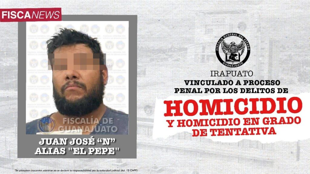 Irapuato, Gto.- 12 de agosto de 2023.- La Fiscalía de Guanajuato capturó a JUAN JOSÉ “N” alias “El Pepe”, acusado de atacar a balazos a una familia en la colonia Urbi Villas del Rey en Irapuato, lo que provocó la muerte de dos hombres, así como lesiones que pusieron en riesgo la vida de cinco personas más, el pasado 07 de mayo del presente año.