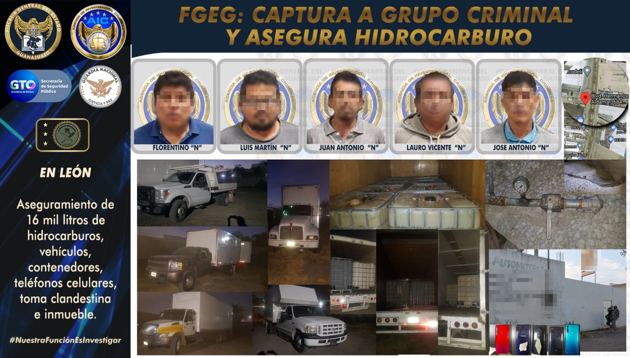 León, Gto. 29 de noviembre de 2021*.- En uso de metodologías y herramientas científicas y tecnológicas aplicadas a la investigación del delito, la Fiscalía General del Estado a través de la Fiscalía Especializada en Investigación de Delitos de Alto Impacto intervino un inmueble localizado en la colonia La Pompa, en donde fueron detenidos cinco sujetos y se aseguraron cuatro tracto camiones, equipos de comunicación, una toma de combustible y 16 mil litros de gasolina.