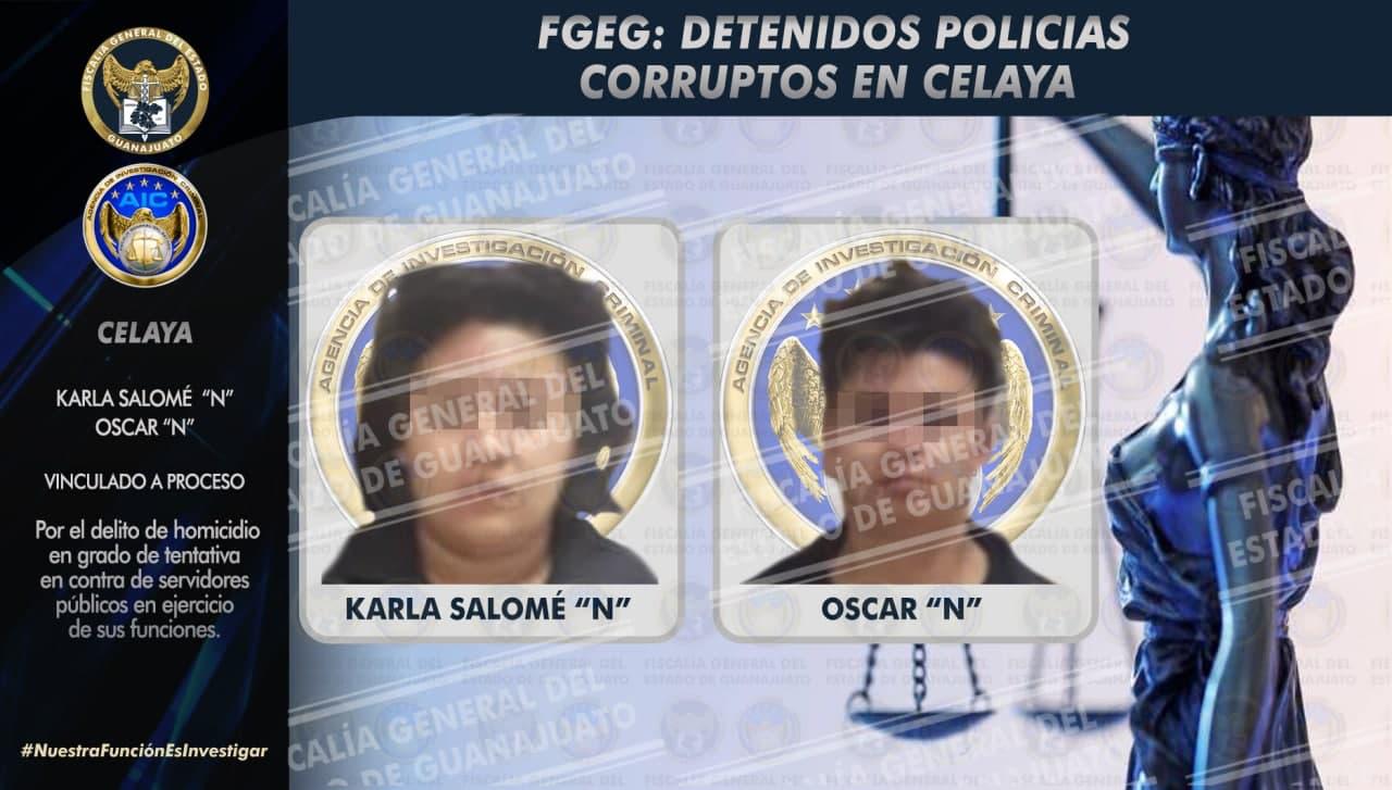 Celaya, Gto. 22 de febrero de 2022.- La Fiscalía General del Estado obtuvo una sentencia de 157 años con 6 meses de cárcel en contra de dos ex elementos de Seguridad Pública, OSCAR “N”, de 28 años y KARLA SALOMÉ “N”, de 25 años, quienes fueron hallados culpables por el delito de homicidio en grado de tentativa en contra de servidores públicos por motivo de sus funciones de seguridad pública.