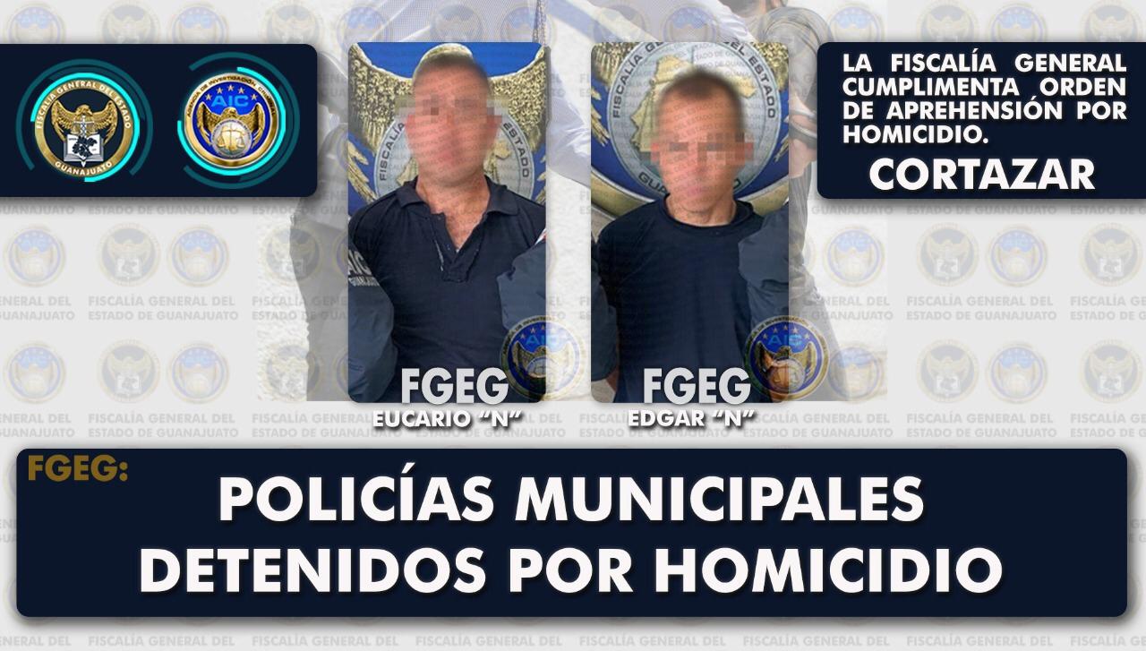 Cortazar, Gto. 06 de octubre 2022*.- Con órdenes de aprehensión, Agentes de Investigación Criminal de la Fiscalía General del Estado, detuvieron a dos elementos de la Dirección del Sistema Municipal de Seguridad Pública del municipio de Cortazar, por su presunta participación en el homicidio calificado de un hombre identificado como Jorge Arturo “N”.