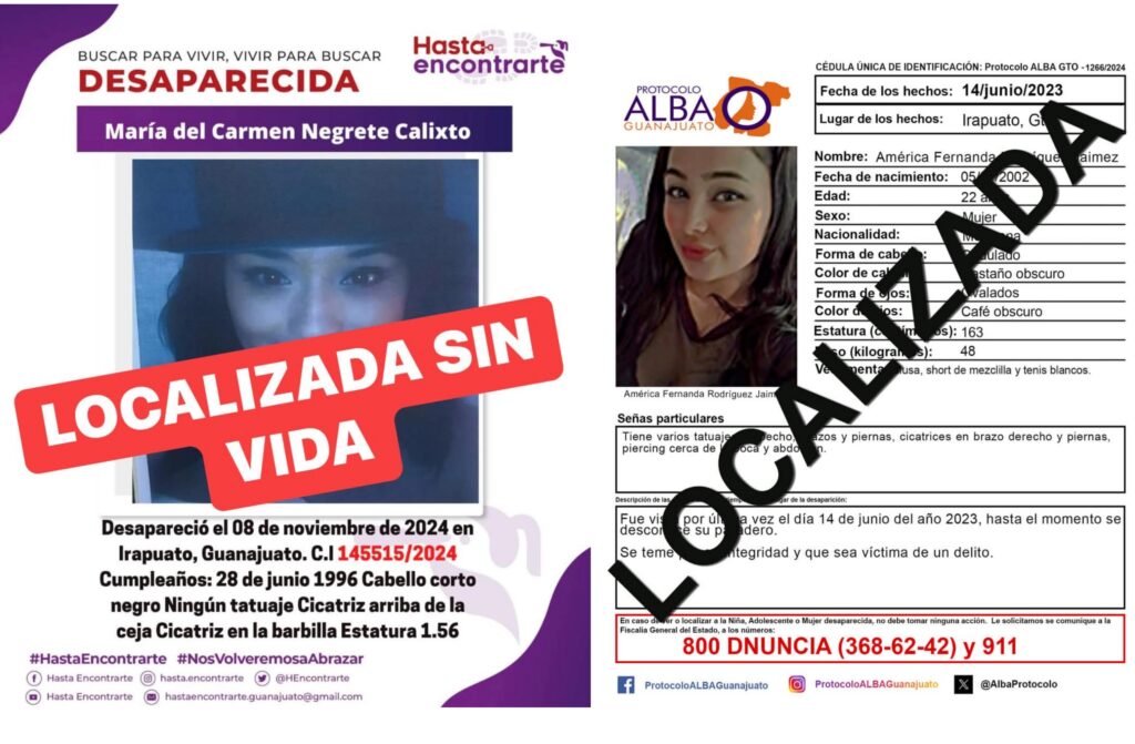 Este 31 de diciembre en la página oficial de Protocolo ALBA Guanajuato, publicaron la desactivación de búsqueda de María del Carmen Negrete Calixto de 28 años de edad y América Fernanda Rodríguez Jaimez de 22 años de edad.
