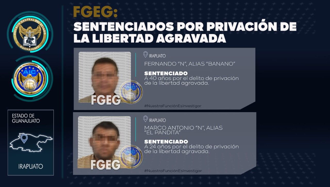 Por lo anterior, un Juez emitió sentencia de condena en procedimiento abreviado, al quedar acreditados los delitos y la responsabilidad por privación de la libertad y sancionado por el Código Penal del estado de Guanajuato, cometidos por MARCO ANTONIO apodado “El Pandita” y FERNANDO “N” alias “El Banano”, a 24 y 40 años de cárcel, respectivamente, y al pago de la reparación del daño.