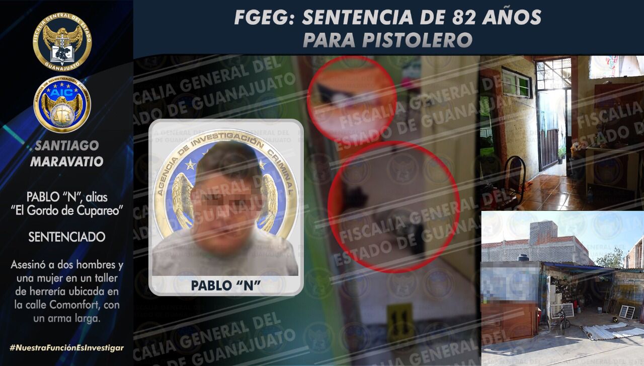 Santiago Maravatío, Gto. 04 de diciembre de 2021*.- Un pistolero ha sido sentenciado a 82 años de cárcel por el homicidio de dos hombres y una mujer. “El Gordo de Cupareo” rafagueo un taller de herrería en la colonia Presidentes y asesino a sus moradores con crueldad, sin darles oportunidad de nada. El acto de razón y voluntad a cargo del juez, se considera justo para resolver este multihomicidio.