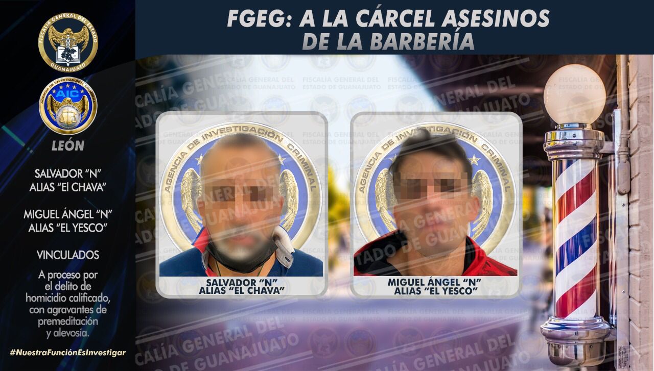 León, Gto., 08 de enero de 2022.- La Fiscalía General del Estado logró vincular a proceso a Salvador “N” y Miguel Ángel “N” por su probable participación en el homicidio calificado con premeditación y alevosía cometido en perjuicio de Jesús “N” conocido como “El Chuyote” de 31 años, a quien asesinaron al interior de una barbería.