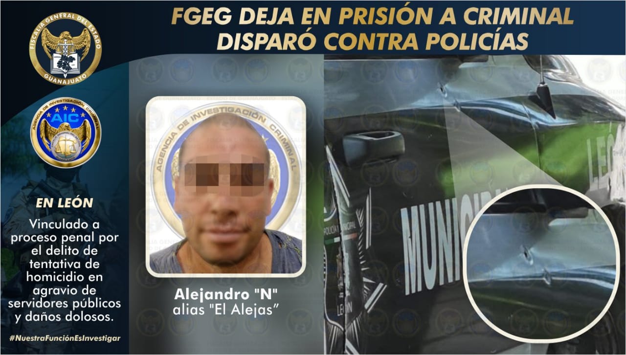 León, Gto. 24 octubre de 2021.- ALEJANDRO “N” alias “El Alejas” intentó matar a dos elementos de la Secretaría de Seguridad Pública cuando estos atendían el reporte por una motocicleta abandonada en vía pública, el pasado 16 de octubre en la colonia San Pablo, en León.
