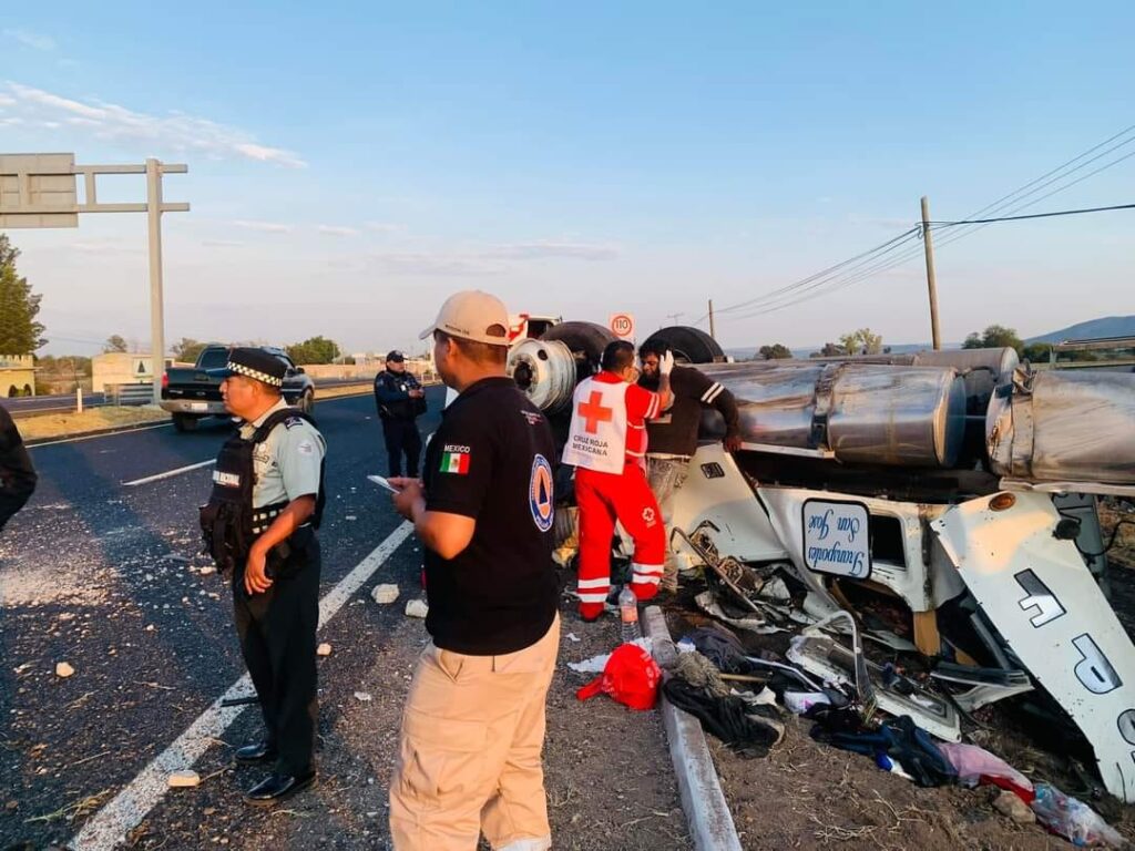 Penjamo.-Un tracto camión volcó la mañana de este miércoles sobre la carretera Pénjamo-La Piedad y el chofer resultó herido.