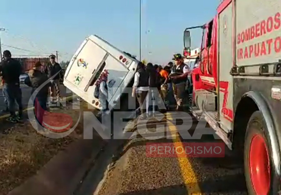 Irapuato.- Un camión de transporte de personal se accidentó la mañana de este jueves frente a la comunidad Purísima del Jardín. Al menos quince empleados de conocida empresa fueron atendidos por paramédicos de los cuerpos de emergencia.